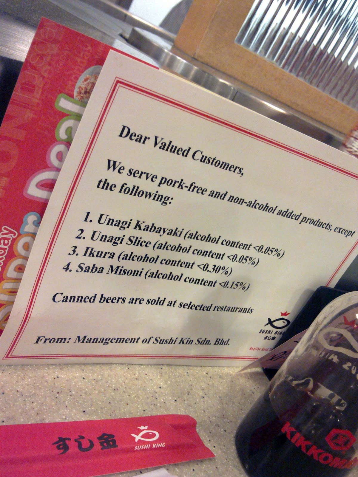 Aku hampir-hampir terorder dan termakan Unagi Slice, selamba je order 2,3 plate lagi. Seb baik yang ambil order tu adalah manager bertugas di Sushi King One Utama. Siap dia tunjukkan Peringatan untuk Pelanggan lagi tu. Mana aku nak nampak sebab benda alah tu tersorok kat belakang menu lain. Nasib baik aku tak amik lagi yang kat atas conveybelt/kaiten tu lagi. Mesti dia ingat aku jenis yang tak menitikberatkan tu semua, oh no! Bukan sengaja bang, tak nampak. Kata manager bertugas tu, current nyer product yang tersenarai je yang ada alkohol, yang sebelum ni takde, katanya lah kan. Huh..dahlah Unagi tu feveret aku. Pasni memang takleh makan lagi la gini.
