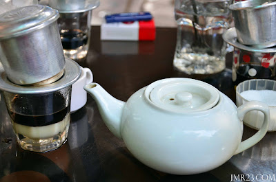 Dalam teko putih tu, ada tea Vietnam. Katanya, sebagai keseimbangan untuk anak tekak, ye la, dah minumnya air kopi yang manis tu, then cuci la segala rongga ngan tea lak kan. Baru clean&clear. Alah, cam pas minum air manis, kita minum air kosong. Gitu la sama konsepnya..