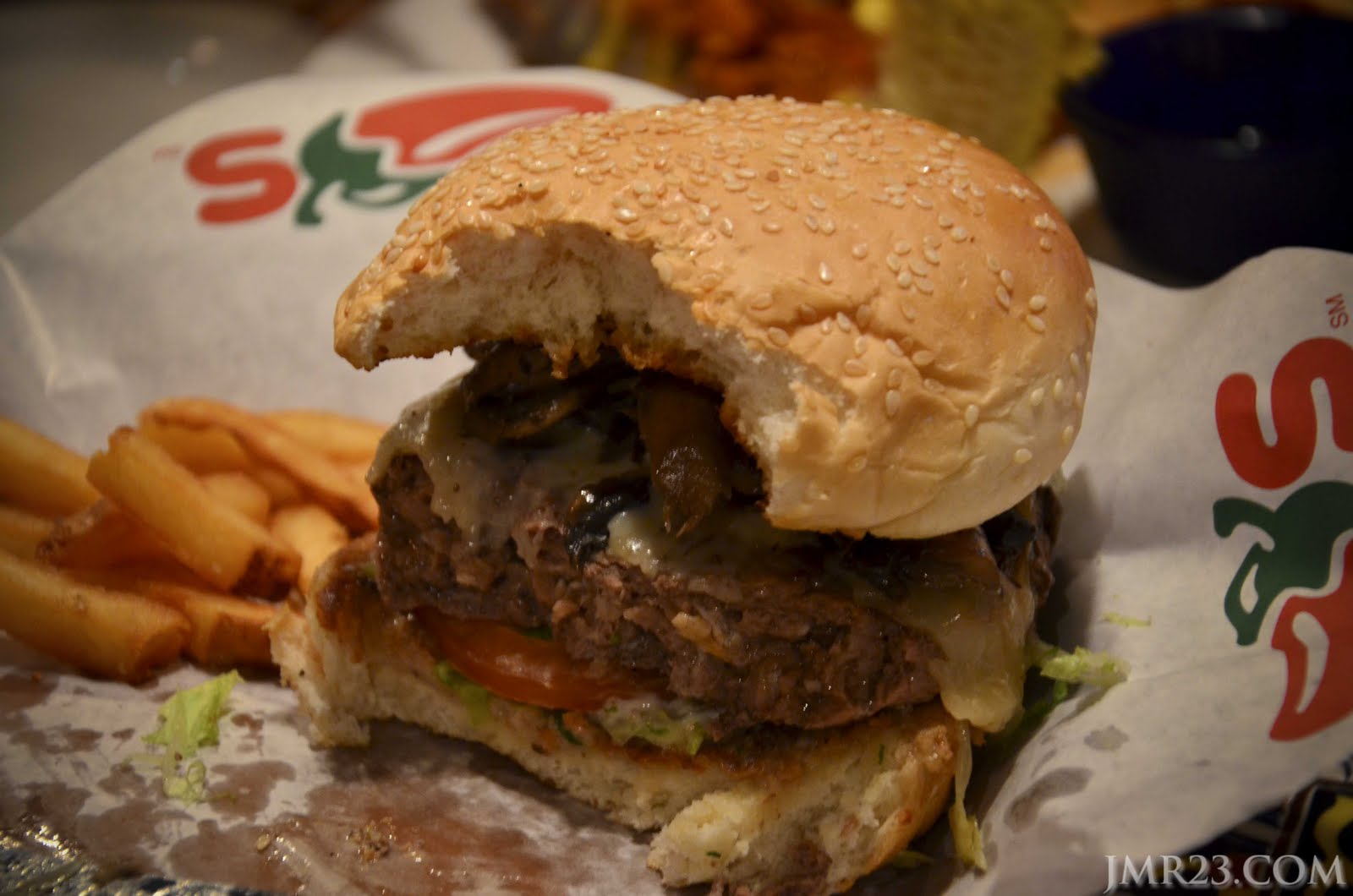 Ini menu untuk orang selera besar..hahahah..Big Mouth Burger-Mushroom Swiss. Terbaik!!! Dengan sos cendawan & kepingan cendawan & cheese yang meleleh keluar. Syorgaa..betul betul memberi cabaran, belum lagi 3/4 aku habeskan, perut dah rasa ketat. Owh demm..tengok gambar dalam menu cam kecik jer..rupa-rupanya anak gajah nye beger.