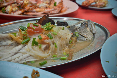 ha, yang ni menu utama. Siakap masak stim. Tengok kepala, dah leh meleleh air liur kan. Tu tak jilat lagi kepala tu. Ni baru betul-betul masak stim. Isi ikan tu segar & manis sangat okkey. Kepala ikan tu, aku ngap sekali shot ajer. Yang ni petua rahsia awek muda kalo makan siakap masak stim.